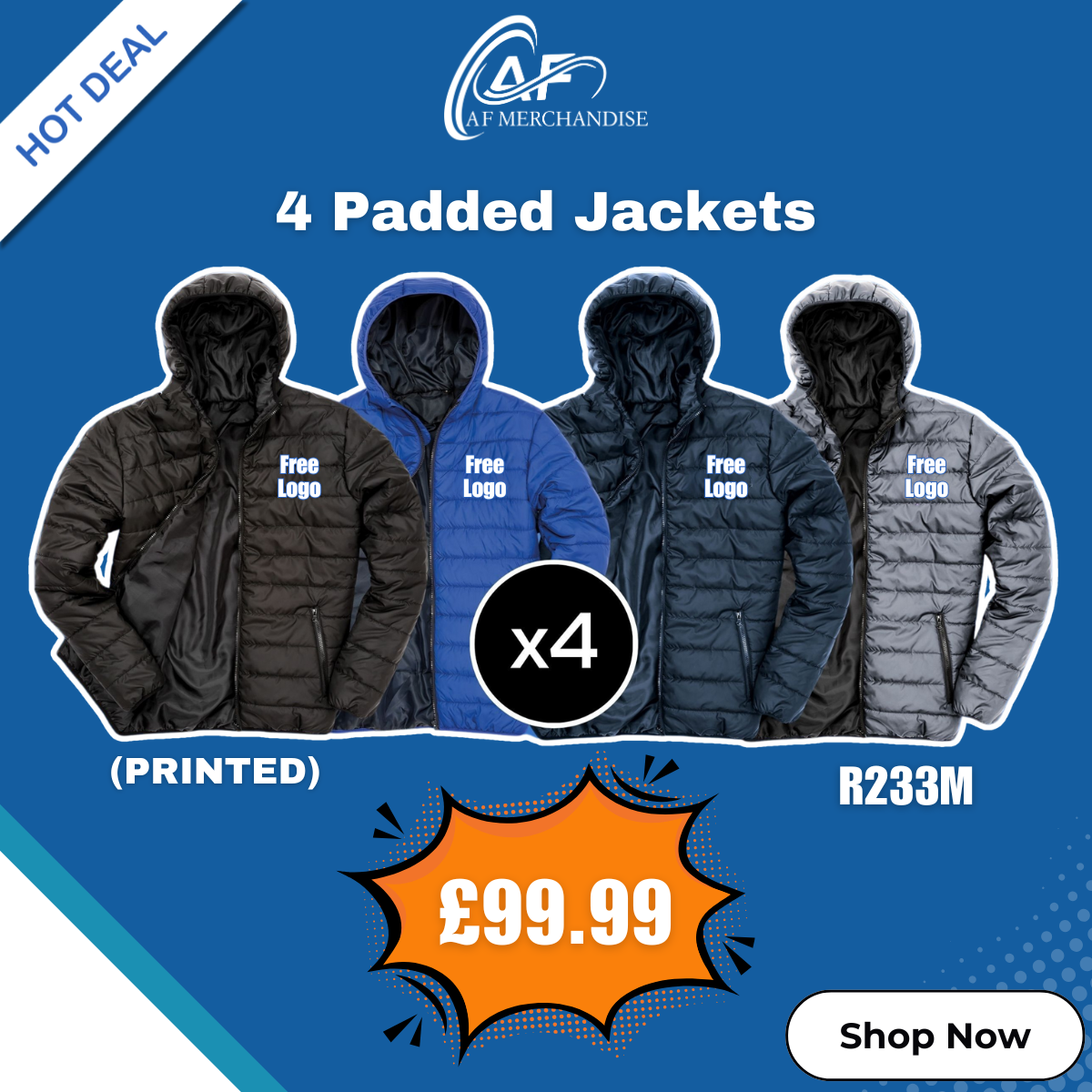 4x Result Soft Padded Jackets with Free Logo Embroidery! Stay warm and protected with the Result Padded Jacket! Designed with polyester padding, a showerproof and windproof exterior, and a grown-on hood, it’s perfect for any weather. With two front zip pockets and reflective details, this jacket combines functionality with style. For a limited time, grab 4 jackets for just £112, including a complimentary embroidered or printed logo. Gear up and save today!