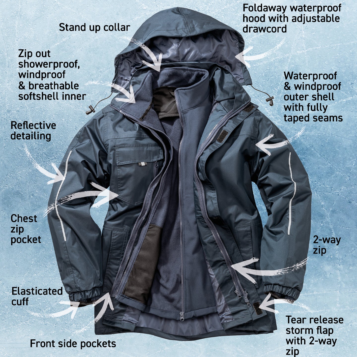 This 2-in-1 waterproof and windproof jacket set offers both protection and comfort for all-weather wear. The outer jacket is crafted from 100% polyester with taped seams and features a waterproof rating of 3000mm. It includes inside pockets, a chest zip pocket, and front side pockets for practicality, along with a tear release storm flap and concealed drawcord hood for added coverage. The reflective detailing ensures visibility in low light.